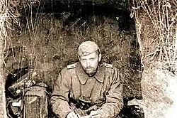 ![]() Machemer writing a letter from a dug-out in Russia (1941/42) | |