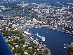 South Harbour (Finnish: Eteläsatama, Swedish: Södra hamnen) is a bay and harbour area immediately next to the centre of the city of Helsinki, Finland. 4.7 million passengers in liner traffic and some 37 000 international cruise passengers travel through it every year. Also over million tonnes of unitized cargo passes through the South Harbour. Most of the harbour's traffic is to Stockholm, Sweden and Tallinn, Estonia, and cruises. In summertime, there is also much small ship traffic.[1] During the winter time, excess snow from snow removal may be disposed of in the harbor. As of 2020, the Carmel, an old vessel, was keeping the harbor open by circling 400 times within 24 hours.[2]