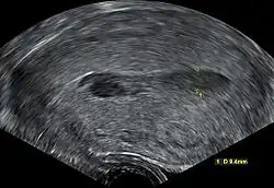 Hematometra is a medical condition involving collection or retention of blood in the uterus.[1] It is most commonly caused by an imperforate hymen or a transverse vaginal septum.