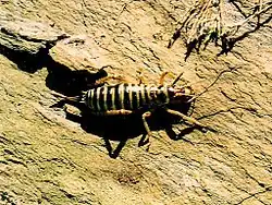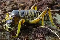 To defend against predators, mountain stone wētā will often "play dead".[14] They lie still for a short time on their back, with legs splayed, claws exposed and jaws wide open ready to scratch and bite.[14] This behaviour is often accompanied with regurgitation when grabbed by a predator which can act as an irritant or toxin.[15][16]