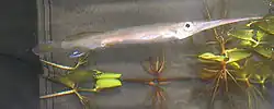 | Subadult female H. pogonognathus, about 4 cm (1.6 in) long. This species clearly shows the extended lower jaw that provides halfbeaks with their common name. | |