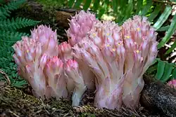 Hemitomes is a monotypic genus of plants containing the single species Hemitomes congestum, which is known as gnome plant and cone plant.[1] This rare and unusual plant is native to the west coast of North America from British Columbia to California, where it grows in dense, dark forests such as the redwood and Douglas fir forests of the region. This is small, fleshy, stemless perennial plant forming lumps in the leaf litter. It is white, yellowish, or reddish-pink in color, like Monotropa and other close relatives, little is known about the life cycle of the plant due to its rarity, but it probably obtains its nutrients by parasitizing fungi, that are part of the Russulaceae, in a similar manner to the rest of its tribe of the Monotropeae, so it lacks the green of chlorophyll.[2] It grows from a rhizome with fragile roots and its form is covered in sparse scales which are the rudimentary leaves. An inflorescence emerges on a thick stalk from the soil bearing solitary to densely bunched flowers. The flowers have ragged yellowish or pinkish petals and contain hairs and large rounded yellow stigmas. The fruit is a fleshy white berry.