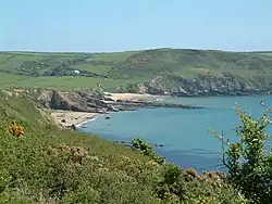 Author David Clegg describes the beach as "small and sandy and just one lovely granite cottage",[2] while the Rough Guide to Britain notes the rocky outcrops, inlets and coves in the vicinity.[3] 0.75 miles (1.21 km) to the east is Lambsoden Cove, accessed via a coastal footpath. There is an estate there with 70 acres of farmland.[4] Nearby is Dead Man Point.[5]