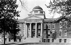 On March 23, 1903 the original building on the Christian University (today's Culver–Stockton) campus, "Old Main", which predated the American Civil War, was destroyed by fire.[5] Appreciating the importance of the college to the town, citizens rallied to its aid. In addition to opening up local churches and other buildings for use as temporary classrooms Canton residents raised $15,000 in just ten days to help the college rebuild.[5] The college was able to salvage some stone and brick from the Old Main rubble, and using it plus the community's donation, an $8,000 insurance payout, and a $15,000 loan to build the current Henderson Hall.[5]