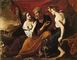 De Somer is believed to have been in contact with Matthias Stom during the latter's stay in Naples in the 1630s. Hendrick's works such as Caritas Romana (1635, private collection) and Tobias curing his father's blindness (c. 1635, Banco Commerciale Italiana, Collezione Intesa Sanpaolo) can be seen as de Somer's reaction to the northern realism of Matthias Stom.[12] In later compositions de Somer reflects influences deriving from the example of other Neapolitan masters who asserted themselves in those years, such as Massimo Stanzione and Bernardo Cavallino. Hendrick's palette moved gradually away from the tenebrism of Ribera and opened up to the neo-Venetian color, which in that period came to replace the chiaroscuro of the Caravaggisti.[6] Works like his multiple versions of Lot and his daughters and his Samson and Delilah are examples of this evolution.[12]