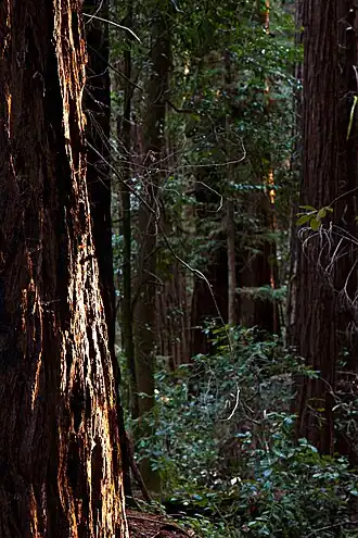 Hendy Woods State Park lies in the Anderson Valley of Mendocino County, approximately a three-hour drive north of San Francisco; it is the only large park within the Anderson Valley. It is about 20 miles from the coast, and because of the distance, it is noticeably warmer than California's coast redwood forests on the coast.[1] The park can be reached via the Philo–Greenwood Road, just off California State Route 128.[2]