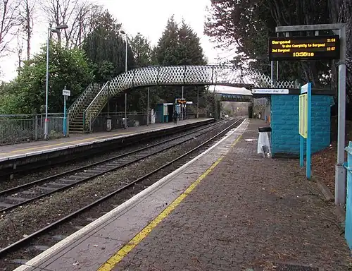 Hengoed railway station serves the village of Hengoed in the county borough of Caerphilly, South Wales. It is a stop on the Rhymney Line of the Valley Lines network.