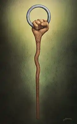 Today, Hennil is often thought to be a pseudo-deity – Thietmar is supposed to have regarded an ordinary stick used in a ritual as a deity;[2] it is often overlooked in scholarly publications. Aleksander Brückner first of all pointed out that around 1010 the sound h (different from ch) did not yet exist in the Slavic languages, he also rejected linking it with the Lithuanian Goniglis and with the word hejnał, which is a borrowing from Hungarian. He considered Hennil to be a German given name and not the name of a Slavic or German god.[5] Slavist and linguist Leszek Moszyński proposed that the word Hennil should be considered a diminutive from Old High German heno "rooster," and that the rooster, which is a symbol of vigilance, may have been included in the spell mentioned by Thietmar. Gerard Labuda considered the word to be the result of a misunderstanding of the greeting "hey-no!".[2] There is also a view that Hennil was a fetish.[3] Ultimately, the etymology of the god's theonym has not been established.[3]
