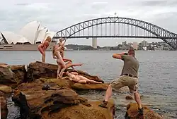 In 2005, von Berg produced a suitable counterpart by photographing the other gender on the other side of the earth. The scandalous series "Naked Sydney" documented a group of happy naked women in downtown Sydney in front of some Australian national symbols, including the famous Sydney Opera House.