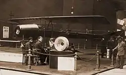 In 1910, in the workshop of Gianni Caproni, he designed and built an aircraft known as the Coandă-1910, which he displayed publicly at the second International Aeronautic Salon in Paris that year.[5] The aircraft used a 4-cylinder piston engine to power a rotary compressor which was intended to propel the craft by a combination of suction at the front and airflow out the rear instead of using a propeller.
