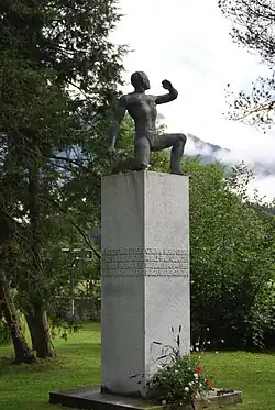 Having become a national hero by successfully avoiding war,[16] Guisan died in Pully on 7 April 1960, aged 85.[2] He was buried on 12 April in Pully, with 300,000 participating in his funeral procession through Lausanne, the biggest attendance at a funeral in Swiss history.[17] His grave is a work by Edouard-Marcel Sandoz.