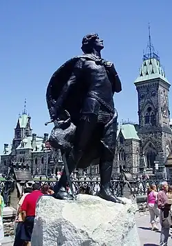 Mackenzie King was deeply affected by his friend's death, and arranged to become head of the government committee charged with finding some way to honour his sacrifice. Both Mackenzie King and Harper had been fond of Tennyson's Arthurian works, and Mackenzie King decided that Harper would be honoured by a statue of Sir Galahad outside the parliament buildings, with the quote cut into the stone base. Sculptor Ernest Wise Keyser was commissioned and the statue was unveiled in 1905.[1] It remains in place today, in one of the most prominent locations in the city just in front of the main entrance to Parliament Hill. It is the only statue not portraying a politician or monarch.