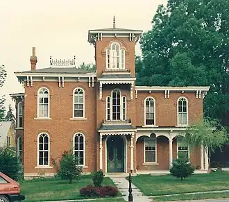 Henry Ambler, a local attorney, bought this property in 1868. There was already a house on it, and Ambler had it altered and additions built. The house shares several details from two earlier Italian Villas built in town in 1858 and 1865.[2] The asymmetrical, two-story brick structure features a three-story tower, bracketed eaves, and a two-story bay window on the south side. Alterations were made in the 1940s, 1954 when it was divided into apartments, and in 1965. The top of the tower was gutted in a fire in 1983 and had to be rebuilt.[2]