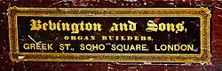 Bevington's organ building business was continued by his sons; Henry and Martin, in Rose Street, Soho, in the same premises as were occupied by Ohrmann. The organ of St. Martin's in the Fields and of the Foundling Hospital in London, and that of St. Patrick's Cathedral, Dublin, were built by the Bevington firm.[8][9]