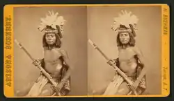 Beyond his work in the studio, Buehman took periodic trips through Arizona Territory. In the summer of 1875, he collected flowers, plants, birds nests, eggs and birds with his friend John Spring. The collection was donated to the Smithsonian Institution.[1] A six-week trip to Fort Apache, Fort Bowie, Camp Grant and San Carlos Reservation beginning in December 1875 produced stereoscopic pictures of various Native Americans at the various posts, including Pinal Apache chief Eskiminzin.[22] Later trips saw Buehman spends weeks at a time with local tribes or photographing various places of interest in southern Arizona.[23] Motivation for these trips was primarily commercial instead of artistic. As his portfolio of images grew he made deals with dime novel publishers and sold copies directly to the public. Buehman's images were also used as part of a "Sell Arizona" campaign.[15] By the 1893 Chicago World's Fair his catalog of images available for purchase included 10,000 photographs of Native Americans.[24]