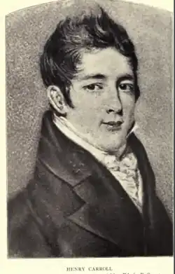 Born around 1792 in Maryland,[2] Henry Carroll was the eldest of eight children of Charles Carroll of Bellevue (1767–1823) and his wife, the former Ann Sprigg (1769–1837). The Carroll family was one of the most powerful in Maryland, descended from Charles Carroll the Settler (1660–1720), the great-grandfather of Charles Carroll of Duddington (1729–1773), this man's grandfather. Although his great grandfather, Daniel Carroll of Duddington (1707–1734) owned the land that eventually became Capitol Hill in the District of Columbia,[3][4] by this time the family operated plantations near Hagerstown in Washington County, Maryland. His brother Charles H. Carroll (1794–1865) would become a prominent politician in New York, and U.S. Congressman.[5][6] Another brother, William Thomas Carroll (1831–1863) served as the 5th Clerk of the United States Supreme Court, and their sister Elizabeth Barbara Carroll (1806–1866) married Henry Fitzhugh who also became a politician in New York.
