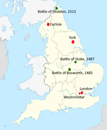 Meanwhile, the King's army under John de Vere, Earl of Oxford, had won a decisive victory over the rebels at the Battle of Stoke 16 June 1487.[65] Clifford was again given responsibility for the safety of York,[66] and he claimed "captenship" over the city, an assertion the city rejected.[67] In 1488 Clifford and Lady Anne both joined the city's Corpus Christi Guild. This does not seem to have restored Clifford in the eyes of the city officialdom, as the following year they again refused him entry, claiming that his intentions threatened the city's liberties. This may well have been prescient, suggests Summerson, as in 1513 Clifford attempted to claim the city's troops for his own army.[1] In 1489 the townspeople, "denyed the entrie of the Lords Clifford and othre, that in nowise noon othre gentilman of what degreor condiconhe he of be suffred to enter this the Kyngs Chaumbre and so all to be excludet and noon to have reule bot the Maiour, Aldermen and the Shireffs".[68] The city's statement came just before rebellion again broke out in Yorkshire, this time against heavy taxes. The commons overran the city and refused to allow Clifford or the sheriff, Marmaduke Constable entry. Instead, the citizens not only allowed the rebels to enter, they provided them a degree of military assistance.[66][note 8] The medievalist David Grummitt comments that the city's reluctance to allow Clifford either office or military assistance is in stark contrast to the fervour with which they served "our ful gode and gracious lorde the duc of Gloucestre" as both Duke and King.[67]