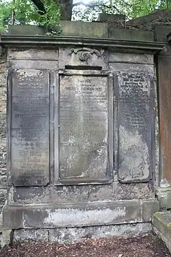 He died on 18 January 1823 and was buried in St Cuthbert's Churchyard on the following day. The grave lies in the north extension facing St John's church.