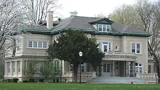 Henry F. Campbell Mansion, also known as Esates Apartments, is a historic home located at Indianapolis, Marion County, Indiana. It was built between 1916 and 1922, and is a large 2+1⁄2-story, Italian Renaissance style cream colored brick and terra cotta mansion. It has a green terra cotta tile hipped roof. The house features a semi-circular entry portico supported by 10 Tuscan order marble columns. Also on the property are the contributing gardener's house, six-car garage, barn, and a garden shed.[2]: 5