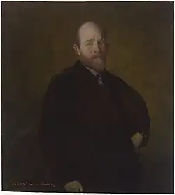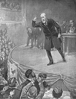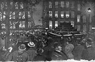 In 1886, George campaigned for mayor of New York City as the candidate of the short-lived United Labor Party.[42][43] He polled second, more than the Republican candidate Theodore Roosevelt. The election was won by Tammany Hall candidate Abram Stevens Hewitt by what many of George's supporters believed was fraud.[44] In the 1887 New York state elections, George came in a distant third in the election for Secretary of State of New York.[23][45] The United Labor Party was soon weakened by internal divisions: the management was essentially Georgist, but as a party of organized labor it also included some Marxist members who did not want to distinguish between land and capital, many Catholic members who were discouraged by the excommunication of Father Edward McGlynn, and many who disagreed with George's free trade policy. George had particular trouble with Terrence V. Powderly, president of the Knights of Labor, a key member of the United Labor coalition. While initially friendly with Powderly, George vigorously opposed the tariff policies which Powderly and many other labor leaders thought vital to the protection of American workers. George's strident criticism of the tariff set him against Powderly and others in the labor movement.[46] In 1897, George again ran for mayor of New York City. However, he had his fatal stroke during the campaign.[47][48]