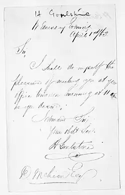 On 1 April 1863, Goulstone sent a note to Donald McLean, confirming an appointment with him for the following day.[9] Unfortunately no account of the meeting has been uncovered, so it is presently a mystery as to why Goulstone went to see Sir Donald. The letter (at right), is currently the only surviving written document of him.