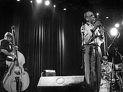 Grimes recorded or performed with pianist Lennie Tristano and saxophonists Lee Konitz, Gerry Mulligan and Sonny Rollins, pianists Thelonious Monk and McCoy Tyner, singer Anita O'Day, clarinetist Benny Goodman and many others.[1] When bassist Charles Mingus was experimenting with a second bass player in his band, Grimes was the person he selected for the job.[1] One of his earliest appearances on film is captured in the Bert Stern documentary on the Newport Jazz Festival of 1958, Jazz on a Summer's Day. Grimes was 22 years old, and as word spread among the musicians about his extraordinary playing, he ended up playing with six different groups in the festival that weekend: those of Benny Goodman, Lee Konitz, Thelonious Monk, Gerry Mulligan, Sonny Rollins, and Tony Scott.[3] And though Henry's name never even appeared in the festival's printed program, New York Times critic Bosley Crowther took note of the remarkable young bassist and listed him as one of the festival's primary players.[4]