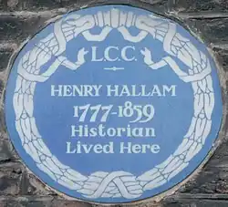 Hallam died in London on 21 January 1859, aged 81. He has a memorial in the crypt of St Paul's Cathedral in London,[13] and there is a blue plaque at 67 Wimpole Street in London installed by the London County Council commemorating the fact that he once lived there.
