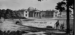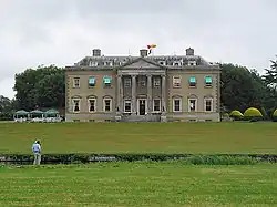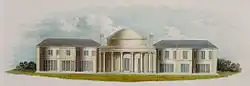 Another joint work was Benham Park[15] 1774–75 designed for William Craven, 6th Baron Craven, three stories high, nine bays wide, in a plain neoclassical style, of stone, with a tetrastyle Ionic portico, the building was altered in 1914, the pediment on the portico was replaced by a balustrade and the roof lowered and hidden behind a balustrade. The interiors have also been altered. Though the Circular Hall in the centre of the building, with its large niches and fine plasterwork, is probably as designed by Holland, it has an opening in the ceiling rising to the galleried floor above and a glazed dome. The principal staircase is also original.