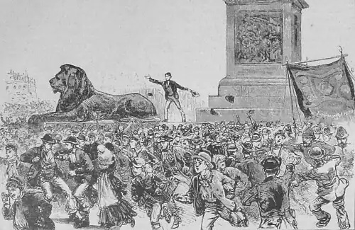 The Trafalgar Square Riots of 8 February 1886 were disorders in the West End of London following a counter-demonstration by the Social Democratic Federation in Trafalgar Square against a meeting of the Fair Trade League.[29][30] The meeting in Trafalgar Square ended in a riot and a destructive attack on the clubs in Pall Mall and St. James Street and on shops in Picadilly and Audley Street, after which another open-air meeting was held near the Achilles statue in Hyde Park. The four SDF speakers, Jack Williams, Henry Hyndman, Henry Hyde Champion and John Burns, were "charged with maliciously and seditiously contriving to disturb the peace, and to incite people to riot and tumult, by inflammatory words moving to hatred of the law and government of the realm". On 17 February they were brought before the chief magistrate at the Bow Street Police Court. After evidence was given by journalists regarding what was said by the defendants at the Trafalgar Square and Hyde Park meetings, the case was adjourned for a week, with the defendants admitted to bail. Belford Bax posted bail for Champion.[31][32][33]