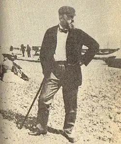 During a 14-month trip through Europe in 1869–70, he met John Ruskin, Charles Dickens, Matthew Arnold, William Morris, and George Eliot. Rome impressed him profoundly. "Here I am then in the Eternal City", he wrote to his brother William. "At last—for the first time—I live!"[23] He attempted to support himself as a freelance writer in Rome and then secured a position as Paris correspondent for the New York Tribune through the influence of its editor, John Hay. When these efforts failed, he returned to New York City. During 1874 and 1875, he published Transatlantic Sketches, A Passionate Pilgrim and Roderick Hudson. In 1875, James wrote for The Nation every week; he received anywhere from $3 to $10 for brief paragraphs, $12 to $25 for book reviews and $25 to $40 for travel articles and lengthier items.[24] During this early period in his career, he was influenced by Nathaniel Hawthorne.[25]