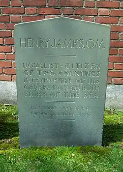 In 1913, he wrote his autobiographies, A Small Boy and Others and Notes of a Son and Brother. After the outbreak of the First World War in 1914, he did war work. In 1915, he became a British citizen and was awarded the Order of Merit the following year. He died on 28 February 1916, in Chelsea, London, and was cremated at Golders Green Crematorium. A memorial was built to him in Chelsea Old Church. He had requested that his ashes be buried in Cambridge Cemetery in Massachusetts.[45] This was not legally possible, but William's wife smuggled his ashes onboard a ship and sneaked them through customs, allowing her to bury him in their family plot.[46]