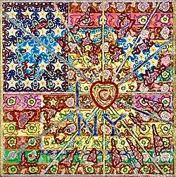 In 1974, the artist emigrated to the United States where he continued to work in the fields of visual art and experimental poetry, combining various art forms. Although he favored brightly colored painting, collage, and clothing design, these often contain verbal elements, such as his favorite, the ubiquitous logo “I [love] N.Y.” where the word “love” is replaced by a heart symbol.[8] The atmosphere of the New York art scene of the 1970s, which was dominated by the East Village movements, naturally provided a basis for Khudyakov’s further evolution as an artist. The East Village art scene, which brought together beatniks, performance artists, musicians, members of the Fluxus community, as well as gave birth to such celebrities as Jeff Koons, Keith Haring and Jean- Michel Basquiat, in many ways resonated with Henry Khudyakov. During this period, the artist’s tools were enriched by "found objects" from the streets of New York. He used them to produce his neckties, shoes, jackets, and shirts which acted as manifestos of his "ideal" world. Acquiring a new skin, made of badges, bottle caps, foil, adhesive tape, stickers, rhinestones, straws, sponges and toys, he would turn mundane objects into precious artifacts, offering new authenticity and new vision.[6] Henry Khudyakov would sometimes spend 20 years finishing a piece. He would record every addition on the back of the canvas focusing more on the artistic process rather than the finished product.