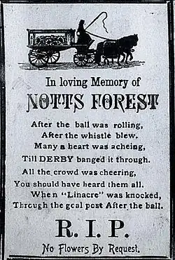 Linacre joined Forest in 1899. A card has been found that records a match between Nottingham Forest and Derby: it would appear from the accompanying verse that Derby won as a result of Linacre travelling backwards with the ball through his own net.