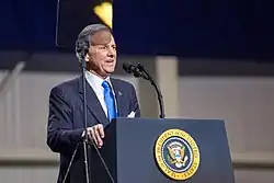 McMaster was elected on a separate ticket from Governor Haley, the last time a lieutenant governor was elected in this manner; as of 2018, candidates for governor and lieutenant governor run on the same ticket.[31] During the 2016 presidential campaign, McMaster was an early and avid supporter of Donald Trump. He claimed to be the first elected politician in the United States to support Trump. After Trump won the Republican nomination, McMaster delivered the nominating speech at the Republican National Convention.[32]