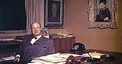 Pearlman in his office at Eastern Cold Storage in New York, NY, with paintings by Modigliani and Manet in the background