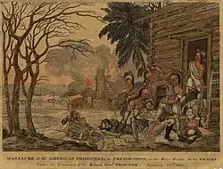 After receiving a false report that Harrison was approaching from the south, Procter ordered an immediate withdraw back to Amherstburg. Since there was a shortage of sleighs, 64 badly wounded prisoners were left behind under the care of a few attendants. Early on the morning of 23 January, about 200 Indigenous warriors entered the village. They robbed the wounded prisoners of their clothing and blankets, killed those unable to walk, and burned the two makeshift hospitals. The survivors were taken away but those who struggled to keep up with their captors were killed. Most were brought to Amherstburg and ransomed by Procter. A contemporary report identified nine victims and estimated that an additional 15 to 18 were killed. This number was greatly inflated in later accounts.[22]