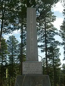 In 1914, the Society of Black Hills Pioneers erected a monument on the road between Deadwood and Spearfish, South Dakota, in the approximate area where Smith's body had been found. In 1994, Highway 85 north of Deadwood, along with the Preacher Smith Monument, was relocated by construction of a four-lane road. A copper time capsule that had been buried in 1914 was opened, providing some period artifacts, such as newspapers; after examination, they, along with additional contemporary items, were returned to the capsule and reburied under the new monument, three miles north of Deadwood on the rebuilt Highway 85. The new monument was rededicated on August 20, 1995, on the 119th anniversary of Smith's murder. The highlight of the ceremony was a reading by local resident, historian, and lawyer Reed Richards of the sermon Preacher Smith had planned to deliver at Crook City that fateful day, 119 years delayed.[2]