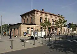The station building was built between 1845 and 1846 after a design by Georg Moller in the neo-classical style on the town side, to the east of the line. The facade of the lower level of the two-story sandstone building is marked on the long side by five bays, the central group of three on the ground floor act as entrances to the vestibule. On the narrow sides of the building there are three bays. The whole length of the eaves of the flat hip roof are decorated with a volute frieze. On both sides of the main building there are approximately symmetrical, single storey extensions. The platform canopy in front of the entrance building is built as lattices on thin columns with small capitals, built in cast iron. The building is listed by the Hessian heritage office as an early railway station of outstanding historical significance.[6]