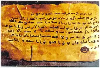 According to Islamic traditions, a letter was sent from Muhammad to Heraclius, through the Muslim envoy Dihyah bin Khalifah al-Kalbi, although Shahid suggests that Heraclius may never have received it.[78] He also advances that more positive sub-narratives surrounding the letter contain little credence. According to Nadia El Cheikh, Arab historians and chroniclers generally did not doubt the authenticity of Heraclius' letter due to the documentation of such letters in the majority of both early and later sources.[79] Furthermore, she notes that the formulation and the wordings of different sources are very close and the differences are ones of detail: They concern the date on which the letter was sent and its exact phrasing.[79] Muhammad Hamidullah, an Islamic research scholar, argues for the authenticity of the letter sent to Heraclius, and in a later work reproduces what is claimed to be the original letter.[79][80]