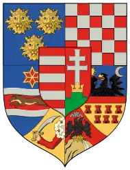After 1867 the eastern part of the empire, also called Transleithania, was mostly under the domination of the Kingdom of Hungary. The shield integrated the arms of the kingdom of Hungary, with two angels and supporters and the crown of St. Stephen, along with the territories that were subject to it: