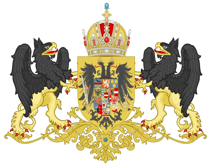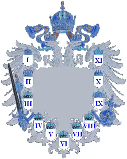 Before 1915, the arms of the different territories of the Austrian part of the Empire (heraldry was added to some areas not shown in the previous version and to the left to the Hungarian part) appeared together in the shield positioned on the double-headed eagle coat of arms of the Austrian Empire as an inescutcheon. The eagle was inside a shield with a goldfield. The latter shield was supported by two griffins and was topped by the Austrian Imperial Crown (previously these items were included only in the large shield). Then, shown in the center of both arms of dominion, as an inescutcheon to the inescutcheon, is the small shield, i.e. personal arms, of the Habsburgs. All this was surrounded by the collar Order of the Golden Fleece.[2][3]