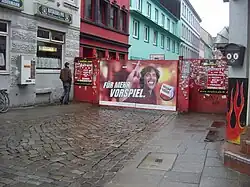 In the 1970s, police added barriers and signs advising youths and women against entering:[5][3][7][4] the former for reasons of protection against harmful influences, the latter because prostitutes would actively seek to chase away any women who entered, thus causing trouble. The signs are written in both English and German. Zutritt für Männer unter 18 und Frauen verboten in German[3] and Entry for men under 18 and women prohibited in English.[6]