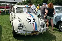 Herbie, the Love Bug is a sentient 1963 Volkswagen Beetle racing car which has been featured in several Walt Disney motion pictures starting with The Love Bug in 1968. He has a mind of his own, being capable of driving himself and often becoming a serious contender in auto racing. Throughout most of the films he is distinguished by red, white, and blue racing stripes from the front to the back bumper, a pearl white body, a racing-style number "53" on the front luggage compartment lid, doors, engine lid, and a yellow-on-black 1963 California license plate with the registration "OFP 857".