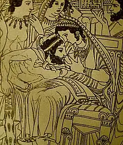 ![]() Drawing of a scene on an Etruscan mirror in which Uni suckles the adult Hercle before he ascends to immortality | |