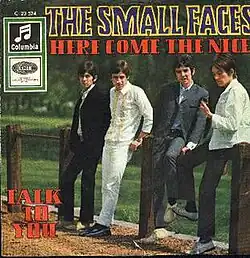 "Here Come the Nice" was eventually released as a single on 2 June 1967;[22][25] this time "Green Circles" was replaced by "Talk to You".[25][nb 4] It was the Small Faces' first single to be released through Immediate Records, which most likely made it susceptible of release;[45] under the stricter Arden, it is likely that the track would not have been issued as a single since it contained subtle drug references,[25][45] alluding to the incident with their parents;[18][45] however Andrew Loog Oldham at Immediate had no problems with the song's release.[22][45] The song features several references to the band's dealer,[25] through lyrics such as "He's got what I need, he's always there if I need some speed".[25] The release of "Here Come the Nice" came to be a tense moment for Small Faces, as the BBC had banned "I Can't Make It" for unknown reasons,[46] which led to a sense of uncertainty regarding the single.[47][nb 5] However, the single managed to bypass the censors,[49] something that Hewitt and Hellier attributed to guilt,[45] while Jones believed it slipped through Mary Whitehouse.[31]