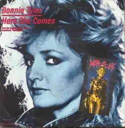 "Here She Comes" is a song recorded by Welsh singer Bonnie Tyler for the soundtrack to the 1984 restoration version of the 1927 German film Metropolis. It was released in 1984 by CBS Records, written by Giorgio Moroder and Peter Bellote, and produced by Moroder. Tyler re-recorded the song on her 2004 album Simply Believe.