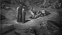 In his Divine Comedy, Dante Alighieri represents the heresiarchs as being immured in tombs of fire in the Sixth Circle of Hell. In Cantos IX and X of the Inferno, Virgil describes the suffering these souls experience, saying "Here are the Arch-Heretics, surrounded by every sect their followers... / Like with like is buried, and the monuments are different in degrees of heat."[4] Among the historical figures that Dante specifically lists as arch-heretics are Epicurus, Farinata Degli Uberti, Frederick II of Sicily, and Pope Anastasius II.