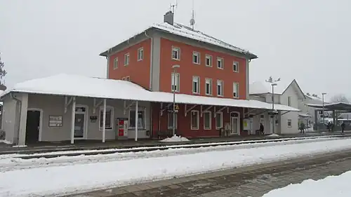 Hergatz station is the station of the Bavarian town of Hergatz. It has three platforms sidings and is classified by Deutsche Bahn as a category 5 station. The station is served by about 75 trains daily operated by Deutsche Bahn and Regentalbahn. Hergatz station is a separation station at the junction of the Buchloe–Lindau railway (MunichLindau) and the Kißlegg–Hergatz railway.