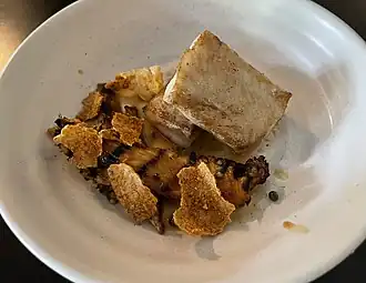 The edible fruiting bodies are common in gourmet cooking, with young specimens considered the best.[29] Alongside shiitake (Lentinus edodes) and oyster (Pleurotus ostreatus) mushrooms, H. erinaceus is used as a specialty mushroom in recipes.[28][30]