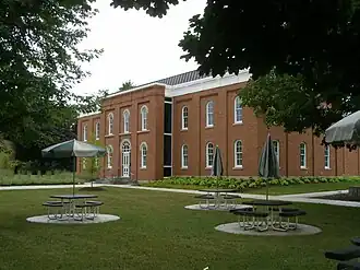 The exterior walls are arranged in a series of two-story bays, each with a tall arched window for each floor, with the substitution of a doorway in five of the bays on the first floor. The three center bays on the front and back project from the main structure. Separating the bays are brick buttresses with chimney traces. Above the second floor windows, the walls of the bays extend out to the face of the parapet, which is flush with the buttresses. The whole structure rests on a low, masonry pedestal which marks the line of the first floor.[6] The pattern of window repetition on the College Avenue side is broken by the arched, double doorway in the center of the building. Originally decorated by a simple masonry arch like the windows that surround it, the central doorway was remodeled with a Georgian styled frame and lintel in 1939.[6] Two wings were added to the back of the building in the twentieth century. The first, a wood-framed barracks, was added for the use of soldiers during the First World War. The barracks continued in use after the war, and in 1925, Heritage Hall was used as the University Library. The wood addition was used as the stacks and were expanded in 1946, with a cement block and brick addition. The library was transferred in 1959 and Heritage was to accommodate offices and classrooms. The deteriorated chimneys were removed. The exterior brickwork was sandblasted and repaired.[6] Heritage Hall, named for Professor Richard Heritage of the music department, was originally known as Flint Hall. John Flint was a local landowner and the builder of the dormitory. In the over one-hundred-year history of the building, it has also served as the shop and classroom for a federal program of veteran rehabilitation after World War I, and from 1925 to 1959 it housed the University Library. At present it accommodates offices for administrative and faculty personnel.[6]